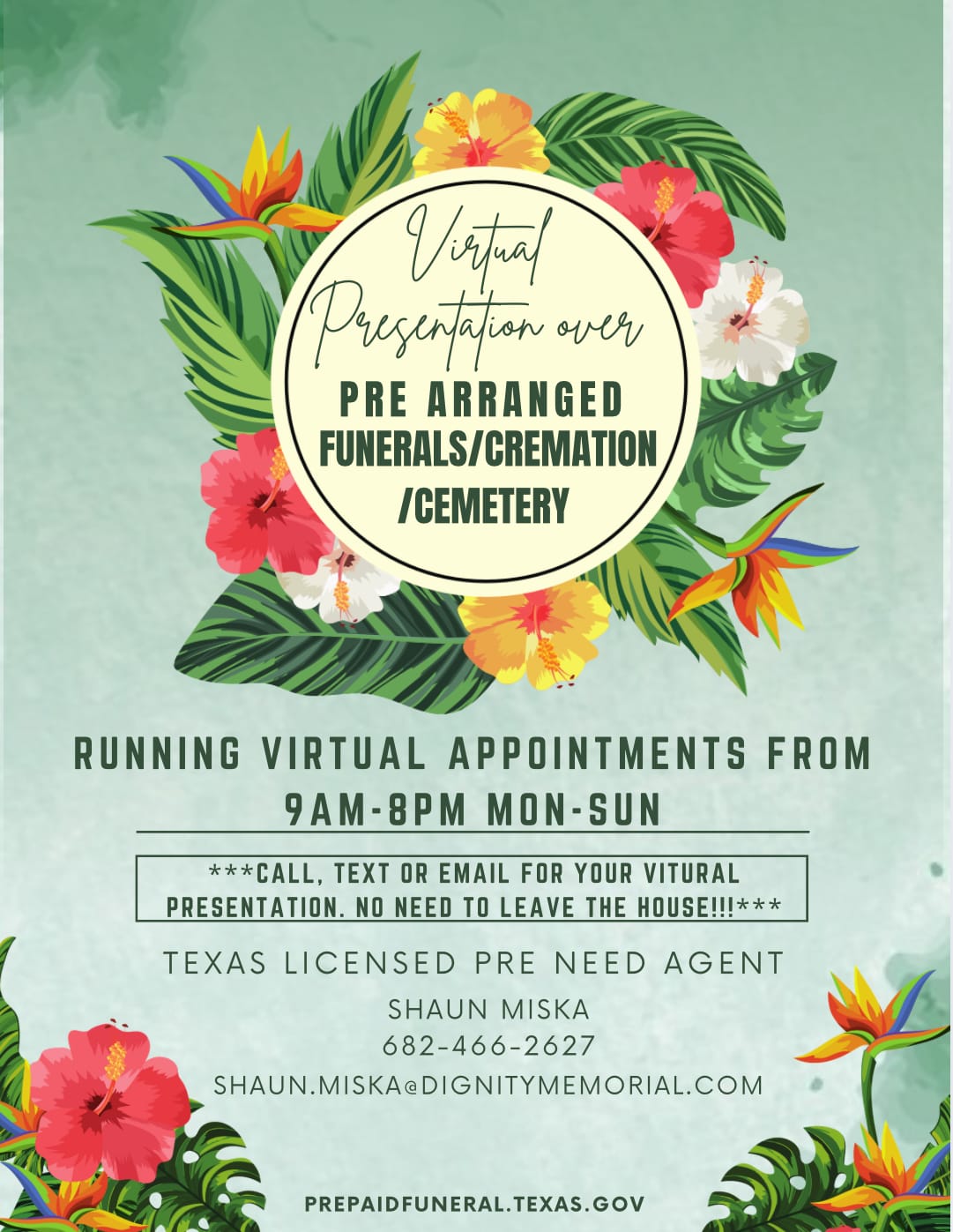 Whether you are looking for pre need info or more on Veteran Burial Benefits, Shaun is here to help you receive your pre approval letter for any National or State Cemetery. Providing the peace of mind pre need cremation, burial or cemetery memorialization brings the family. Shaun will be reaching out to set a one on one appointment, in which he will provide The Veterans Planning Guide and all cost for services or cremation. For more on pre-planning, visit www.prepaidfuneral.Texas.gov.